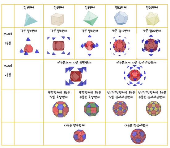 정20면체의 모서리를 깎아내면 그 단면이 오각형이 된다.