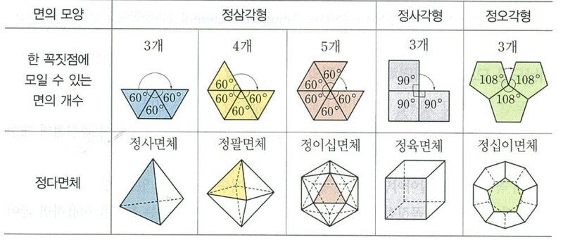 한 점에서 만나는 3개 이상의 면의 각도의 합이 360도보다 작아야지 입체 모형이 된다. 360도가 되는 순간 평면이 되면서 다면체가 될 수 없다.